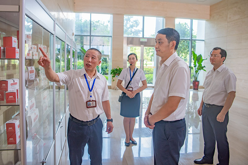 刘海军书记先后参观了劲牌持正堂药业展厅、劲牌智慧药房、中药提取中心。就劲牌中药材选育、数字化炮制流程的运用、中药数字化提取及中药颗粒制剂等相关内容进行深入了解,并现场体验了智慧药房的数字化诊疗。
